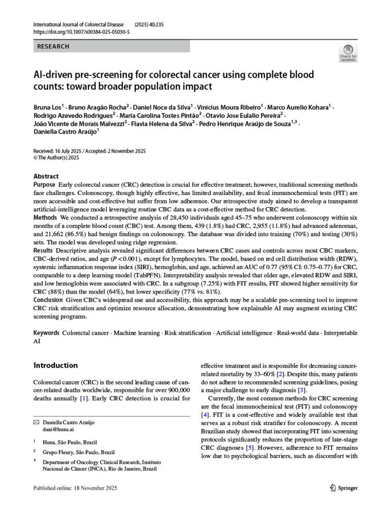 Um estudo brasileiro publicado em 2025 no International Journal of Colorectal Disease, conduzido por Bruna Los, Bruno Aragão Rocha, Daniel Noce da Silva, Vinícius Moura Ribeiro, Marco Aurello Kohara, Rodrigo Azevedo Rodrigues, Maria Carolina Tostes Pintão, Otavio Jose Eulalio Pereira, João Vicente de Morais Malvezzi, Flavia Helena da Silva, Pedro Henrique Araujo de Souza e Daniella Castro Araújo, analisou se a inteligência artificial aplicada ao hemograma comum poderia ajudar a identificar pessoas com maior risco de câncer colorretal.